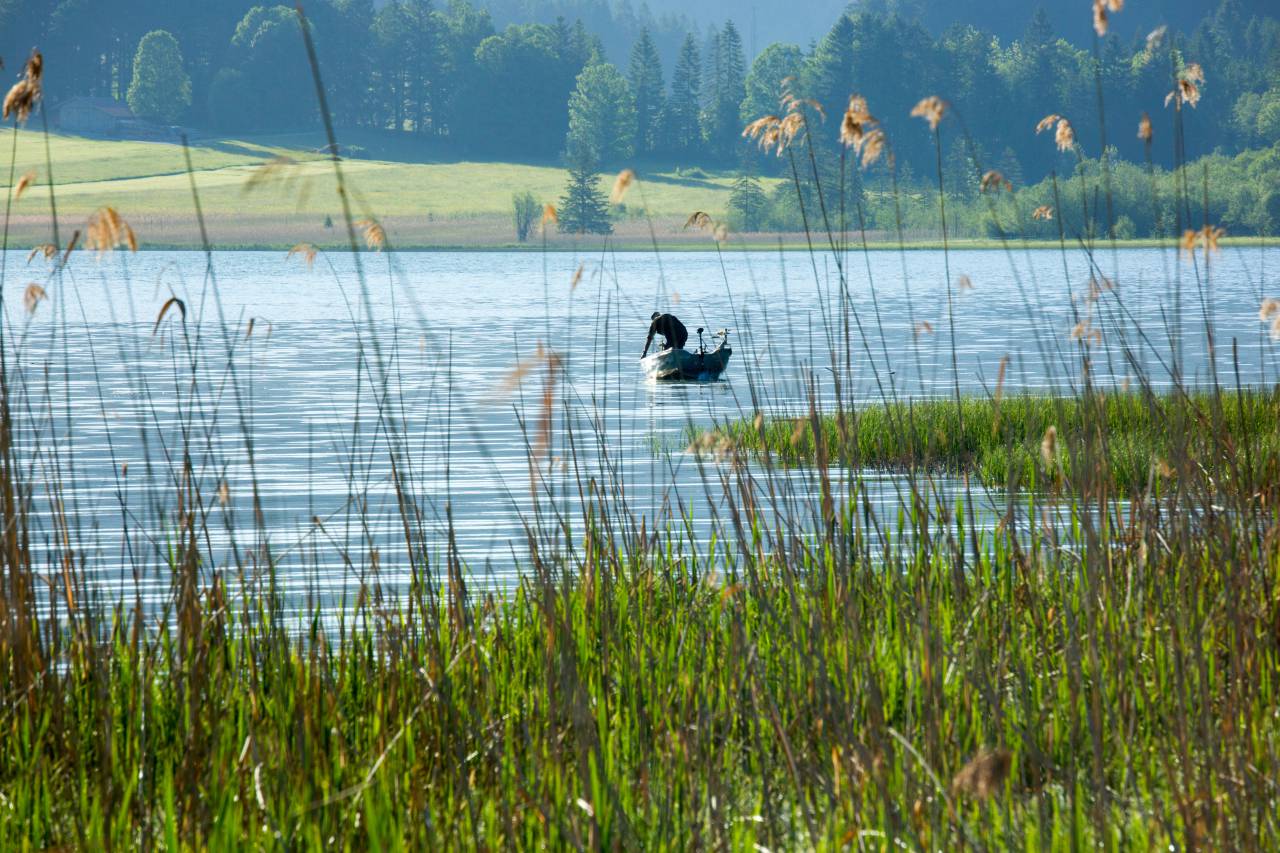 An manchen Stellen umgibt ein Schilfgürtel den Haldensee. Enten gleiten über die Oberfläche. Hechte, Renken, Karpfen und weitere Fische tummeln sich im Wasser.