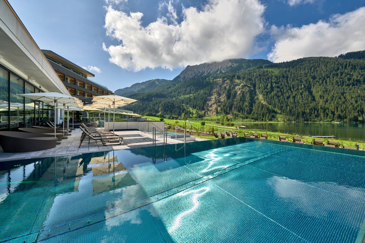 Direkte Seelage am Haldensee, Adults-Only-Ruhe, moderner Wellnessbereich, designstarke Zimmer & Suiten sowie vielfältige Naturerlebnisse im Tannheimer Tal.